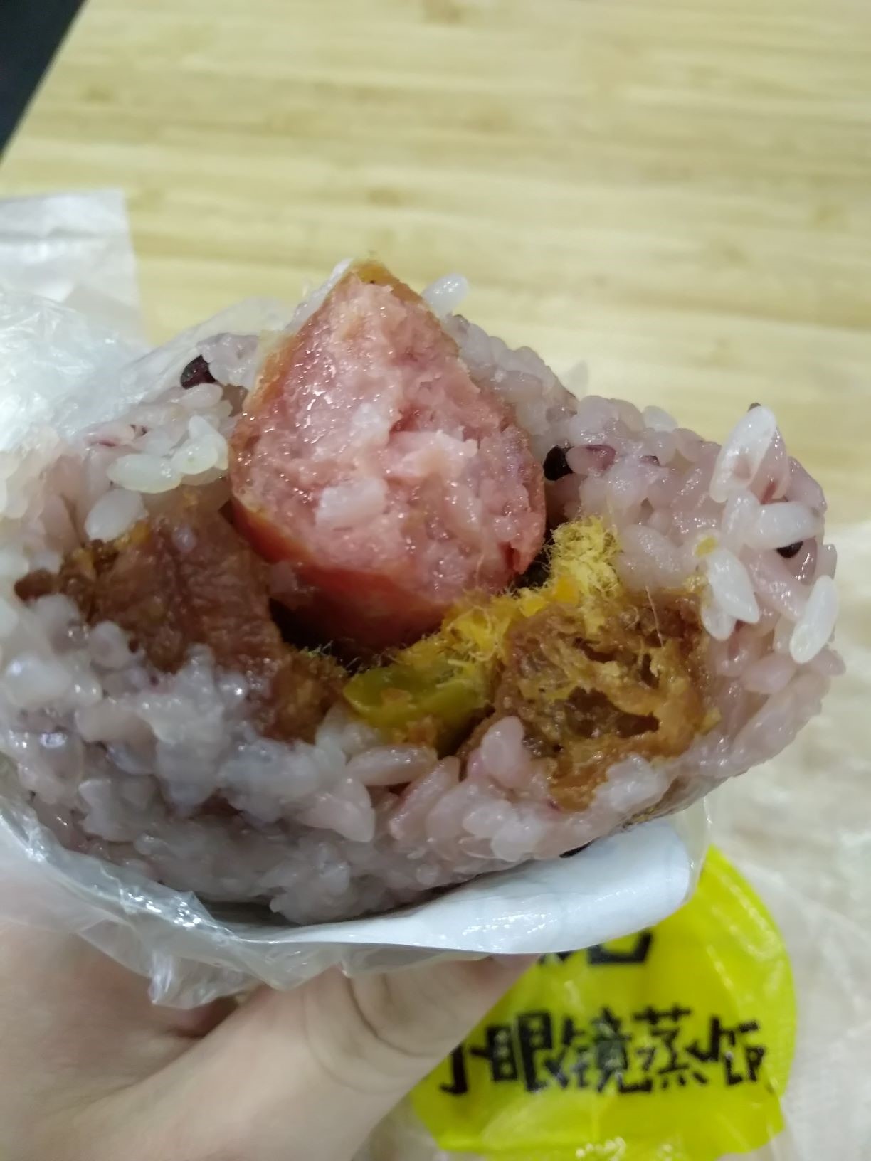 这家店在热闹的新街口,去的时候马上要关门了,人不是很多。点了一份招牌+烤肠,其中烤肠就是平常随处可见的烤肠。招牌版的蒸饭里面加入了酸豇豆,吃进去有淡淡酸味。另外里面还有鸭蛋黄,肉松,油条。鸭蛋黄略带咸味,口感沙沙的,肉松是平常的肉松。鸭蛋黄和肉松配合起来,一沙一软,口感很奇特。油条炸的比较脆,吃蒸饭的时候咬到油条,有嘴里一惊的感觉。总体来说口感比较丰富,米,烤肠,蛋黄的沙,肉松的软,酸豇豆的酸,油条的脆。值得一吃吧。