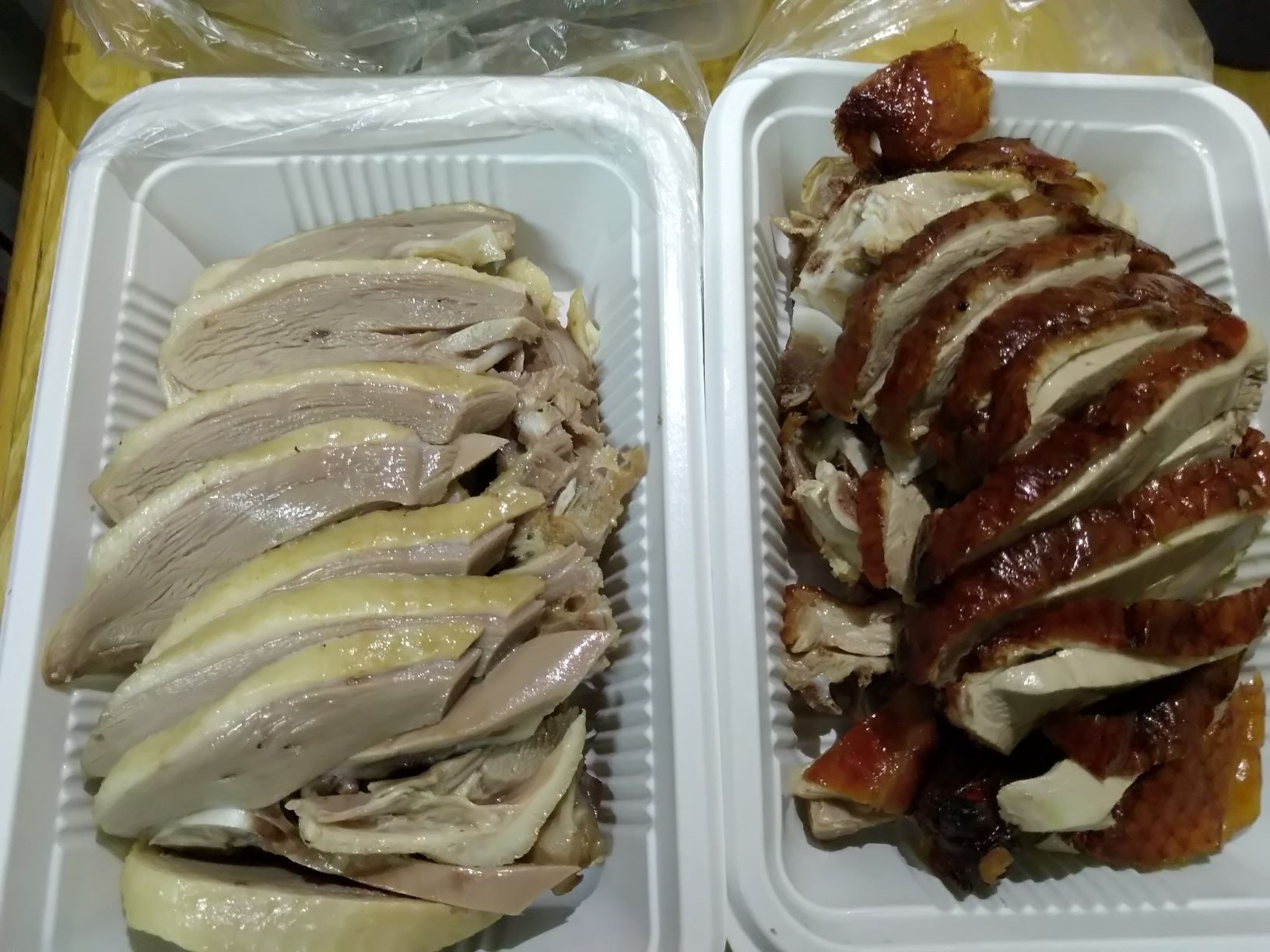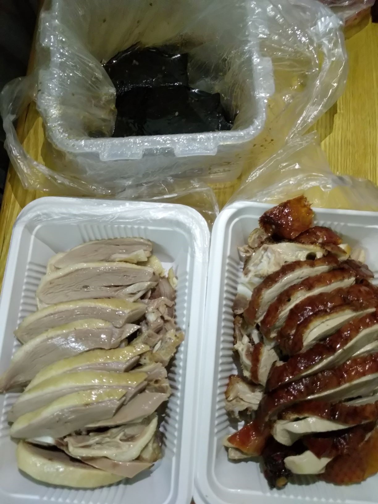 本来以为可以想北京烤鸭一样,坐在那里拿饼卷鸭肉吃一顿,结果根本没有那一套,只有鸭肉和酱。点了烤鸭和盐水鸭,自动会送一份酱汁。对于吃了很多年烤鸭的我,这份烤鸭也是平平无奇,没什么特点,也不难吃。盐水鸭有淡淡的八角香味,味道不是很咸,应该算比较好吃的吧。这几年一直听说南京的盐水鸭是特产,可是周围的人普遍觉得盐水鸭不好吃。这可能是第一个让大家觉得还不错的盐水鸭。对于酱汁,和北方的酱汁还是有区别的,比较有特色的,和鸭子搭配起来表现不错。记得以前吃烤鸭,要么和甜面酱卷饼,要么直接吃,不沾送的酱汁。这份烤鸭还是沾酱汁比较好吃。