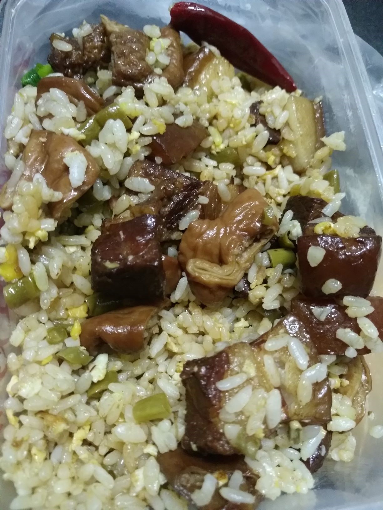记得当时拍毕业照,直接点了外卖,本来以为要一个小时才能送过来,结果大概二十分钟就送过来了。这份爱马仕炒饭加了酸豇豆,大肠,红烧肉。肉的量很足,吃起来非常爽。放的油比较多,使炒饭整体比较香,但不是很腻。感觉多加点菜就更好了。