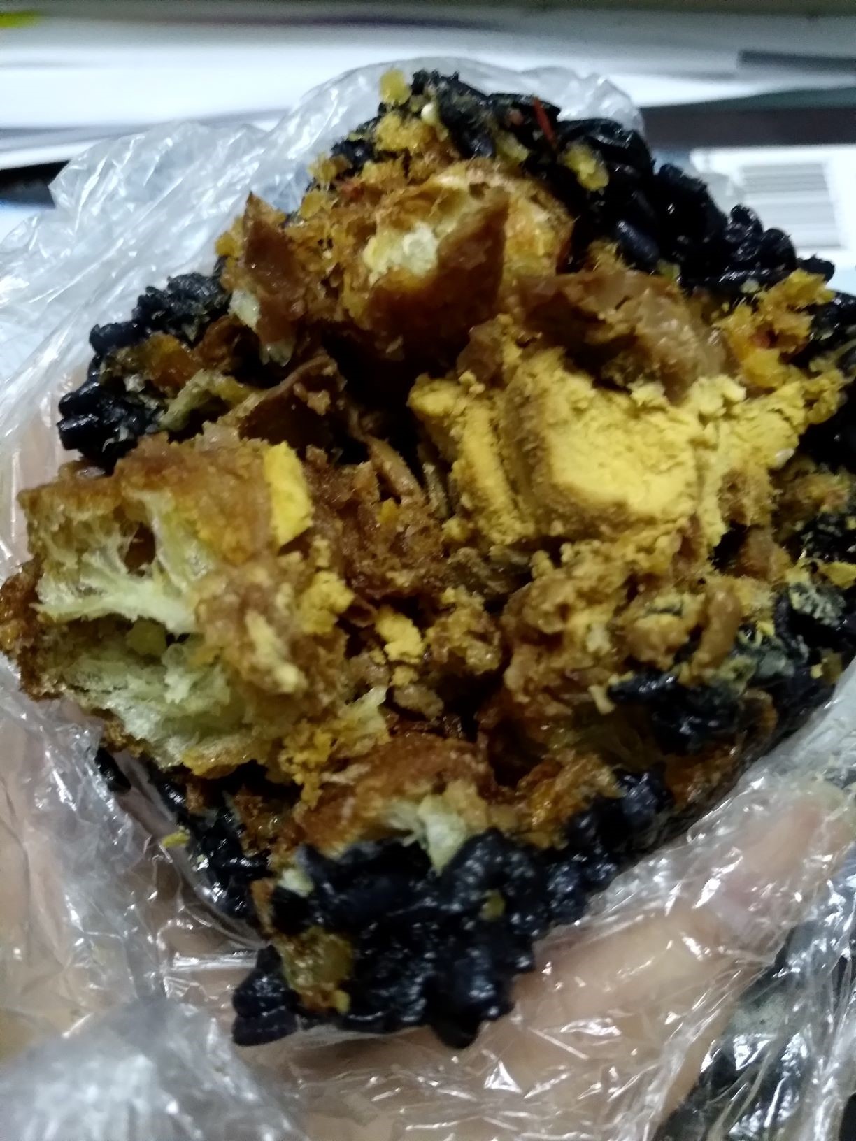 默认是加油条的,我又加了肉松和卤蛋。首先分量是很大,一个乌饭差不多500克,足够吃饱了。外面一层乌饭中规中矩,没什么特别。里面的油条非常好吃,下次可以单独点油条吃一吃。肉松和卤蛋搭配进来使整体味道不错。单独吃乌饭比较干,适合和粥之类的一起吃。总之,乌饭不错,值得一吃。