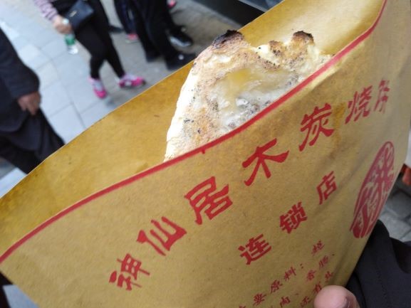烧饼在炉子内壁上烤熟,比较薄,烧饼的外皮比较脆。里面的梅干菜香甜,有一点酸味。适合刚烤出来就吃,凉了口感就不好了。