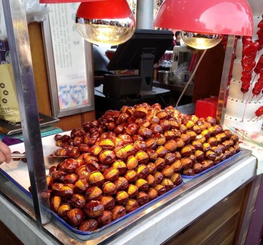 外观很漂亮,板栗很大,外面裹着层糖,在灯光衬托下十分诱人。但是,板栗不是现做的,不是很热,口感比较硬,也没有糖的甜味,没有香味。